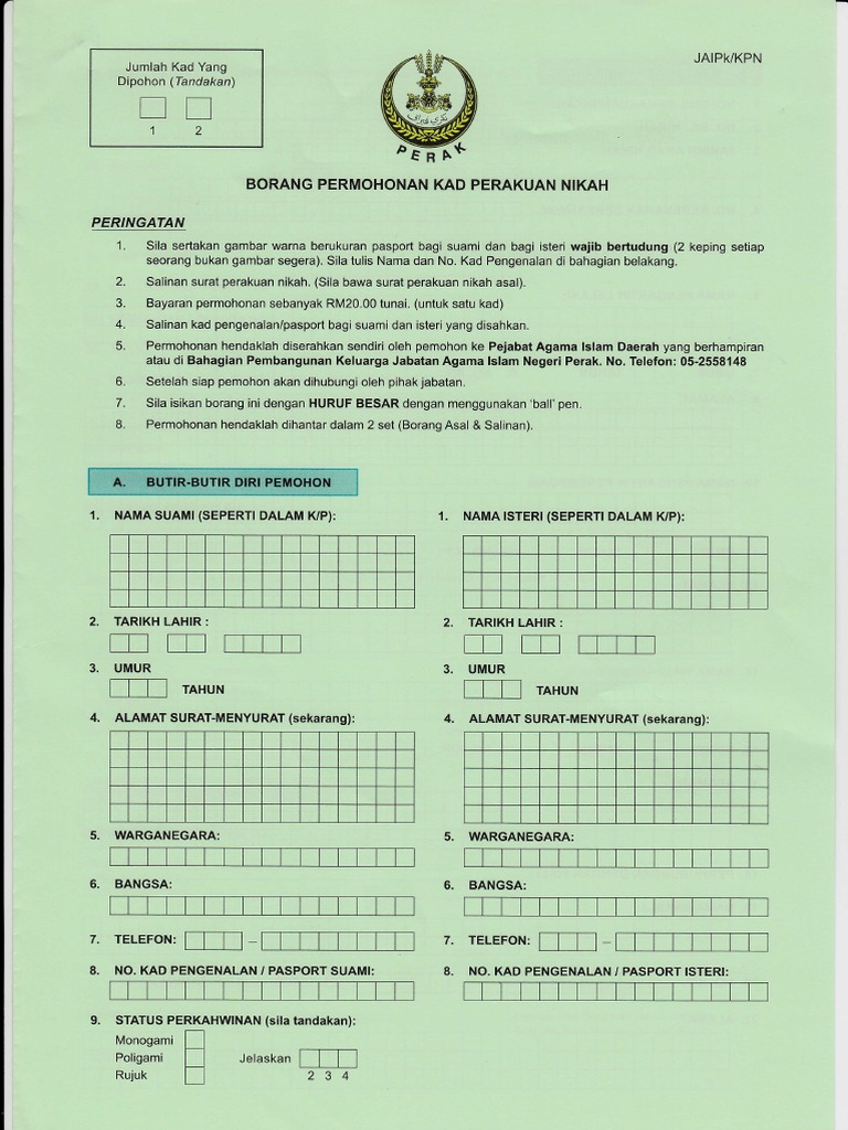Borang Permohonan Kad Perakuan Nikah Dicetak Menggunakan Kertas A4 Berwarna Kuning Pdf
